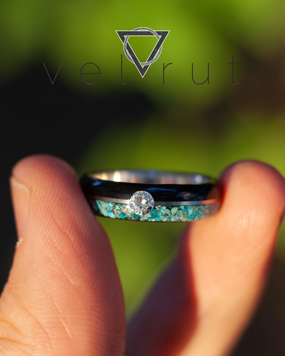Tam Kenarli Turkuaz Gumus Serit Ve Tektasli Sarma Ahsap Yuzuk Velrut Ahsap Yuzuk