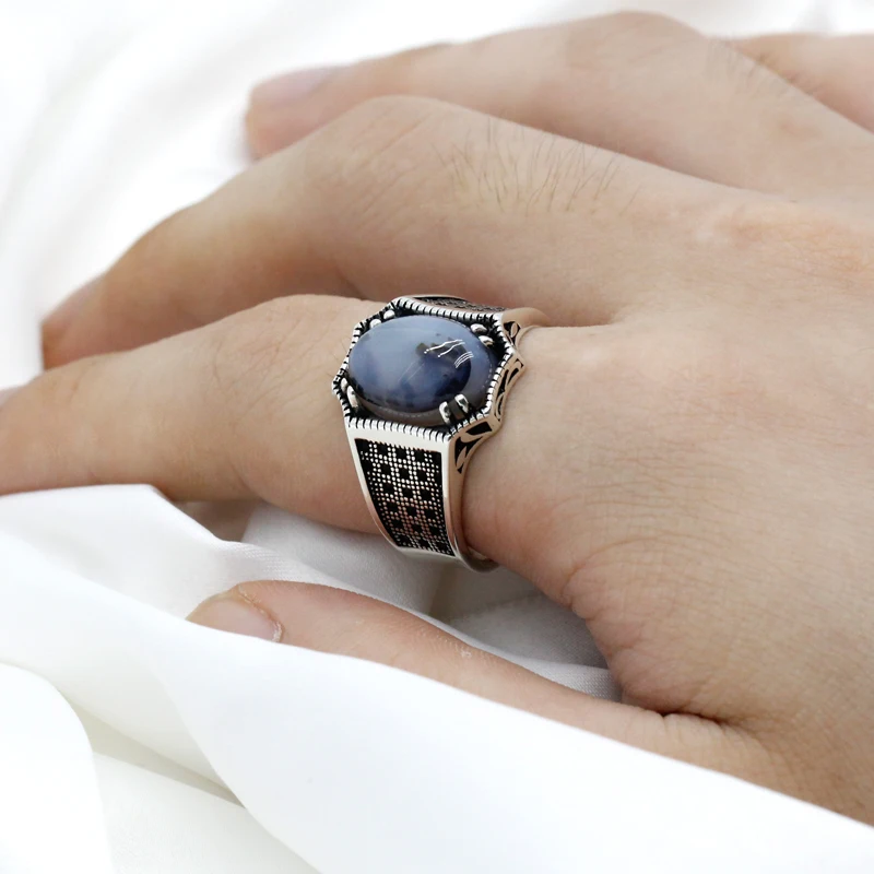 925 Ayar Gumus Desenli Oval Mavi Akik Tasli Erkek Yuzuk Erkek Yuzukleri Yuzuk Gumus
