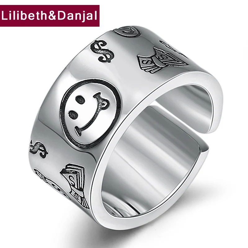 Erkekler Kadinlar Ayarlanabilir Yuzuk Gercek 925 Ayar Gumus Sembolu Karikatur Gulen Yuz Acilis Dugun Yuzuk Taki Accesorios Mujer R13 Halkalar Aliexpress