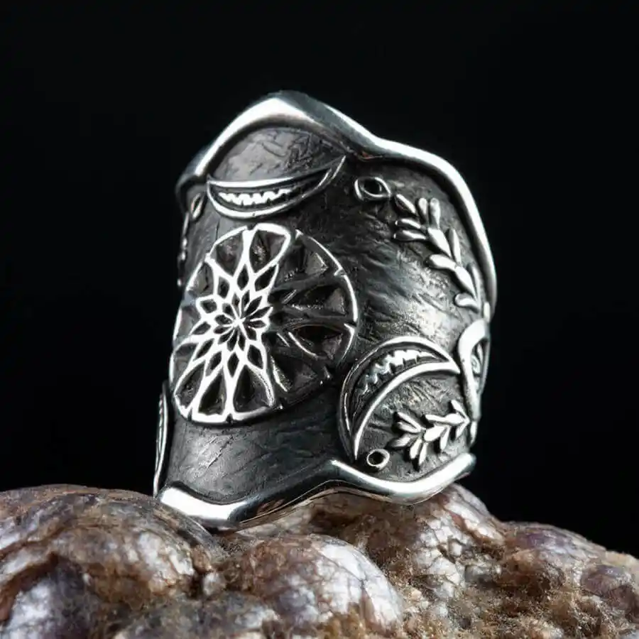 Kayi Boyu Desenli Ay Yildiz Modeli Gumus Erkek Yuzuk Dirilis Taki