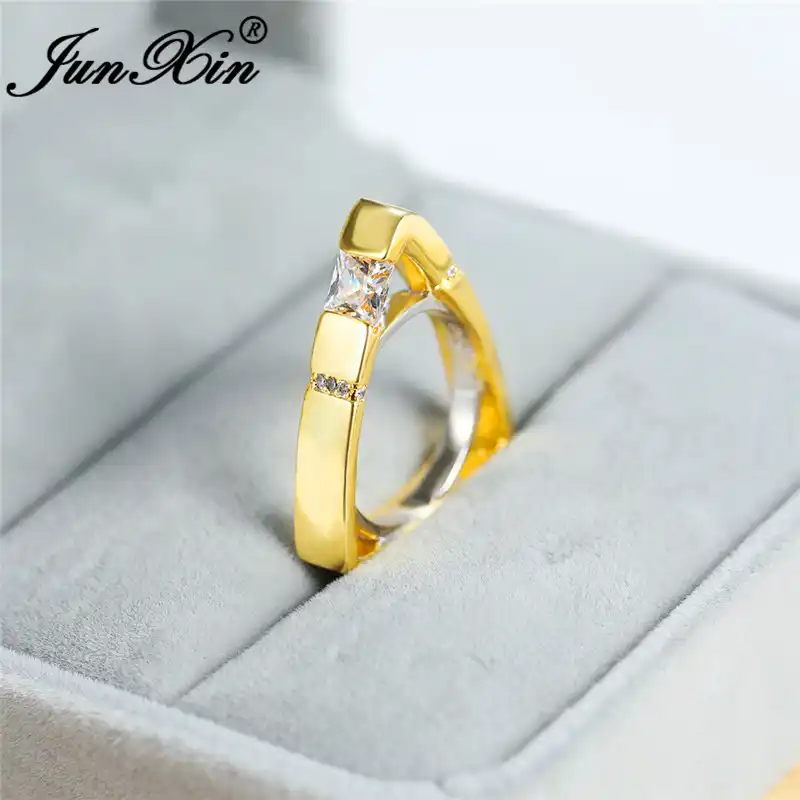 Benzersiz Geometrik Ucgen Yuzuk Dugun Bantlari Iki Ton Beyaz Sari Altin Kare Beyaz Kristal Tas Alyans Kadinlar Icin Nisan Yuzukleri Aliexpress