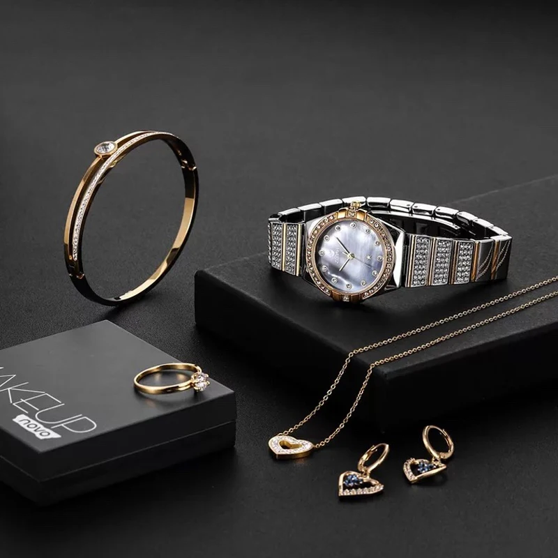 Yeni Marka Kadinlar Akis Kum Kristal Saat Bilezik Kolye Kupe Yuzuk Seti Kadin Mucevherati Seti Moda