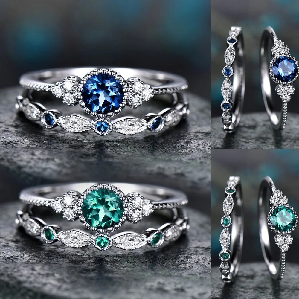 Eskitme Silver Renk Metal Mavi Tasli Bayan Otantik Eklem Yuzuk Seti